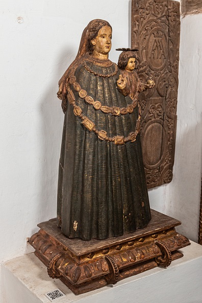 La Virgen de Loreto viste una capa azul de donde brota el niño Salvador del mundo. Su modo de estar estótico es propio de esta Virgen, muy venerada desde la Edad Media. Prácticamente no se ven los miembros. Sobre la capa lleva tres collares con perlas y joyas. Estos nos recuerdan la veneración y los dones que recibe de parte de todos los reyes de Europa. La Virgen de Loreto simboliza el lugar de la encarnación del Hijo de Dios.