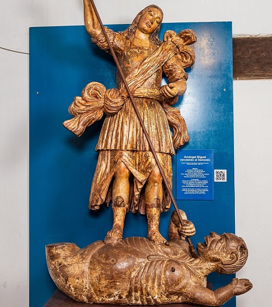 La representación clãsica del Arcángel San Miguel está de pie sobre un demonio, con una lanza en la mano derecha y el brazo izquierdo flexionado hacia adelante.