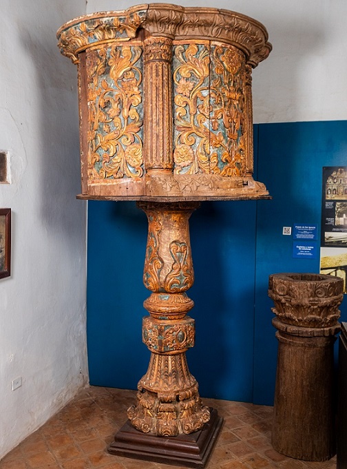 El púlpito formaba parte del mobiliario del templo, madera dorada y policromada del Siglo XVIII, muy ornamentados, finamente tallada, proviene del altar principal del antiguo templo.